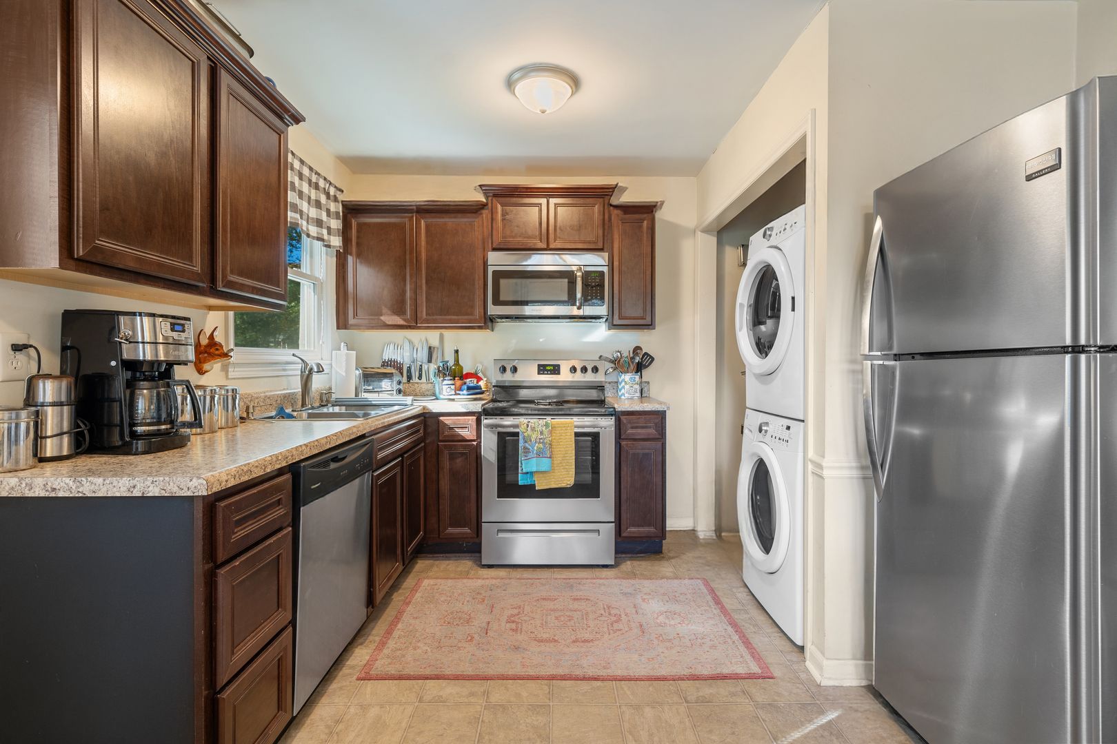 The home opens up to the large living room with luxury vinyl plank flooring throughout. Eat-in kitchen sports all the needed stainless steel appliances with plenty of space for two home chefs! All three bedrooms are toward the back of the home with the primary bedroom housing a half bath. Head outside to view the phenomenal outdoor space with a wrap around deck and a huge fenced in backyard. Perfect for any pet owner! Washer and dryer included in rent as well.