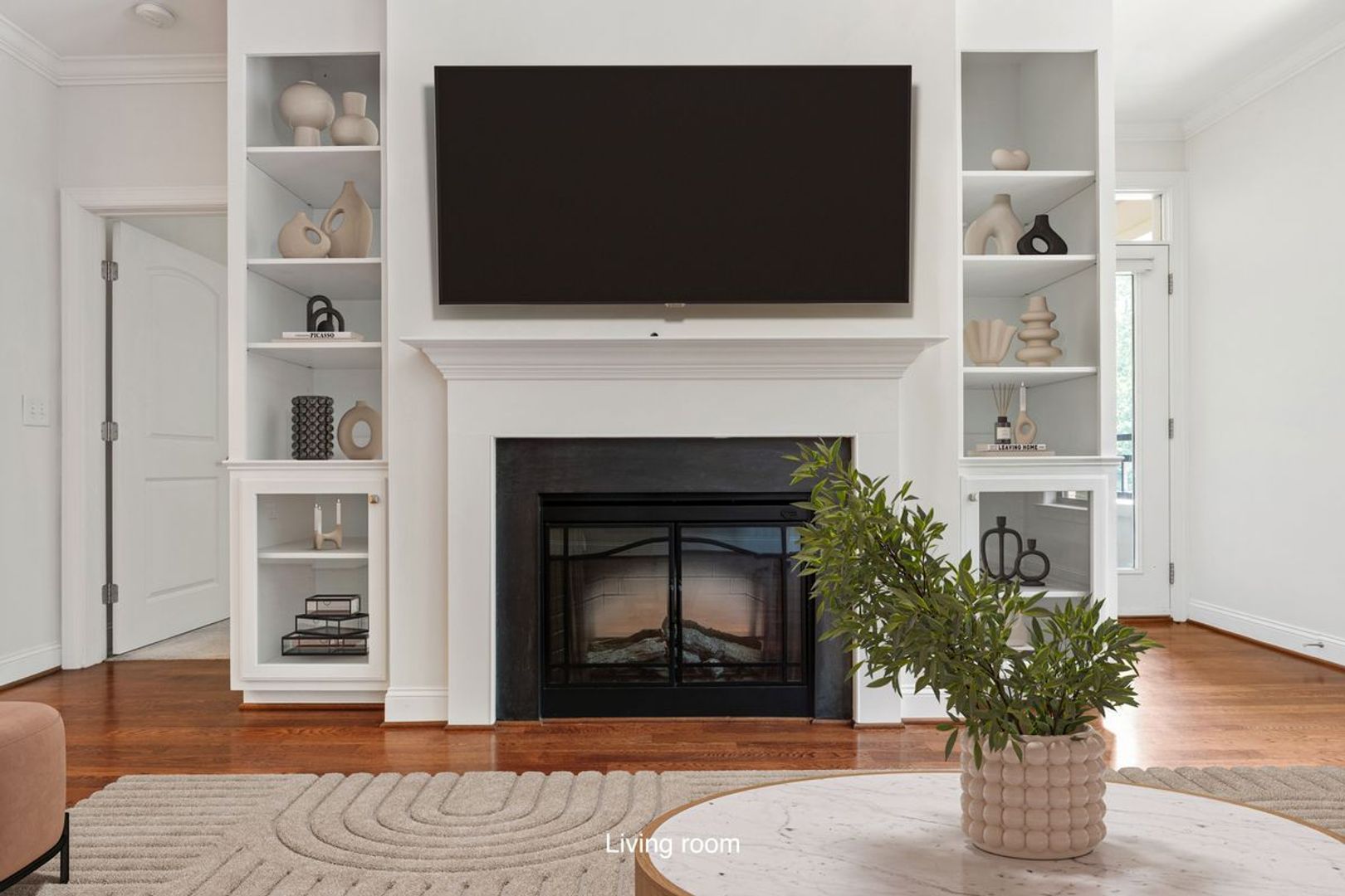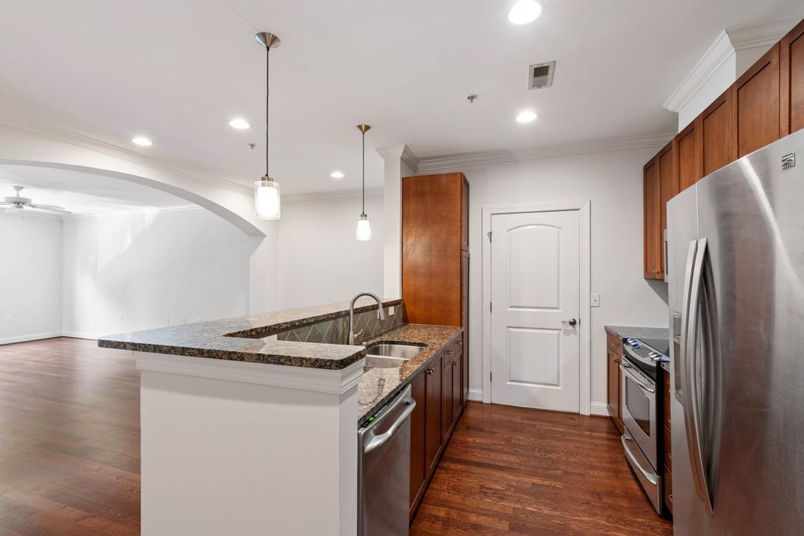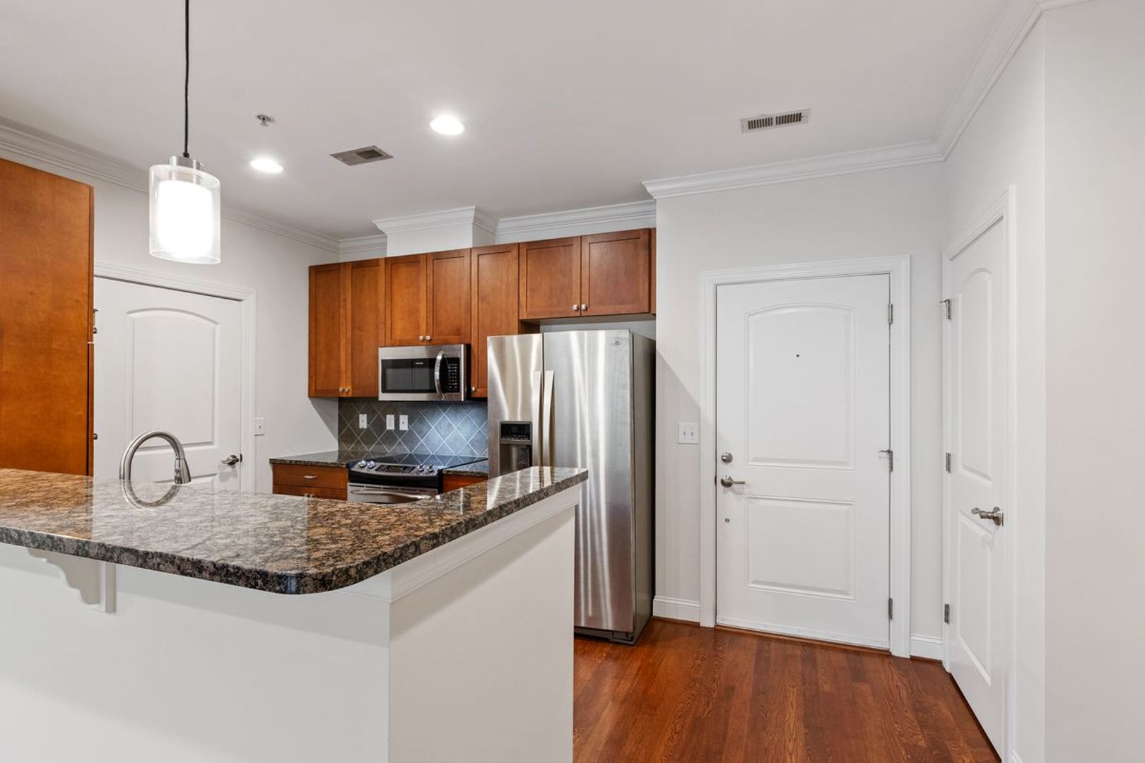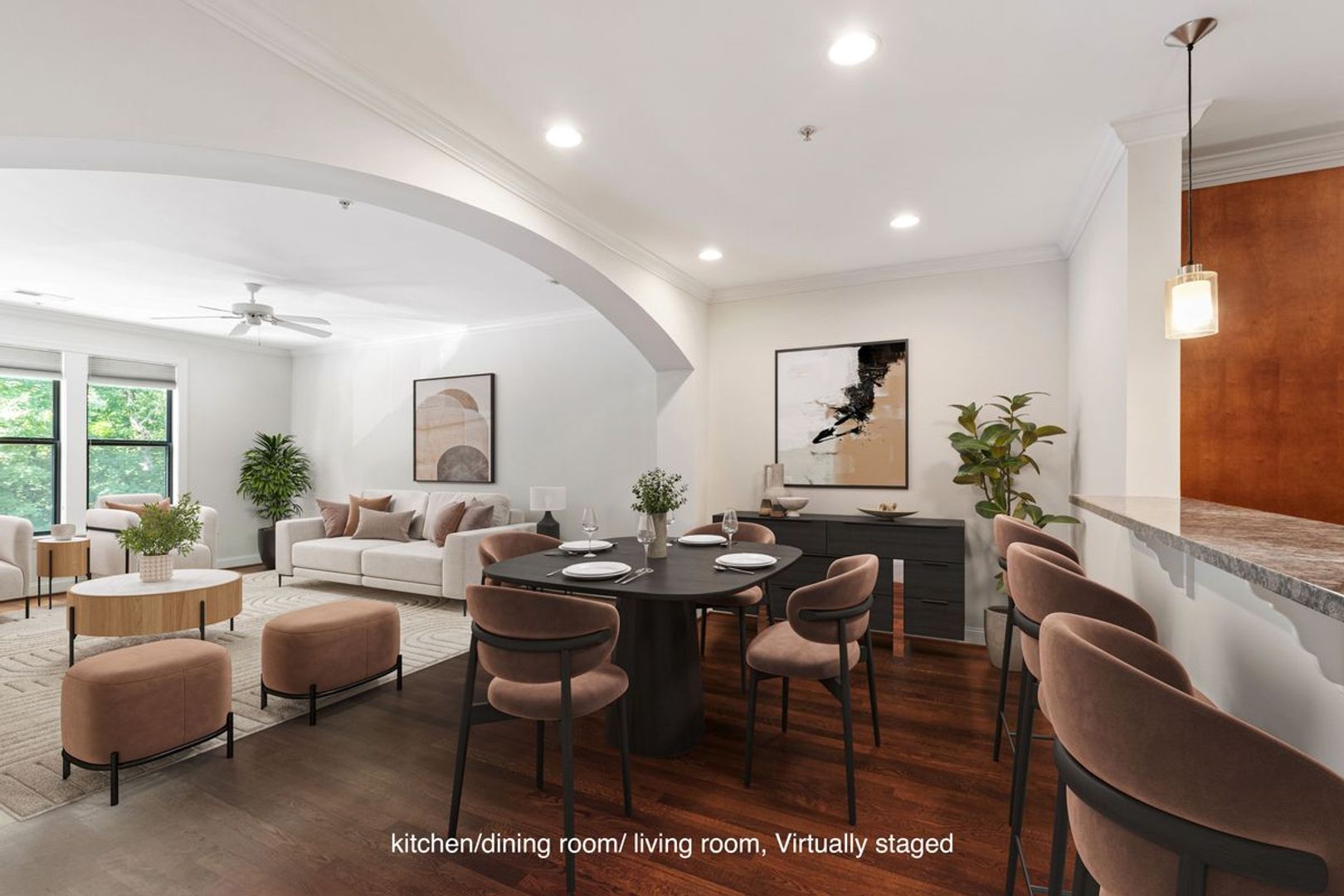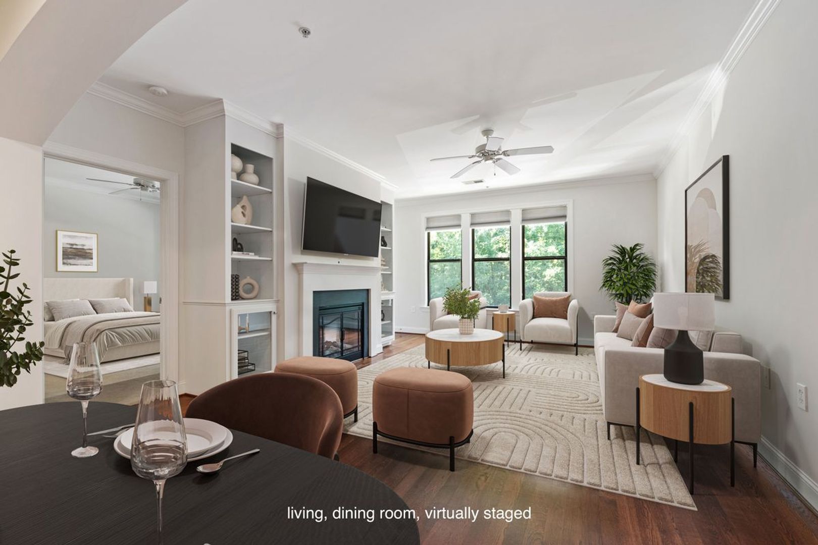 Inside, the condo features an open-concept layout that seamlessly connects the kitchen, dining, and living areas—ideal for both everyday living and entertaining. Rich hardwood floors add warmth and elegance throughout the main space, while the modern kitchen is equipped with sleek stainless-steel appliances and ample cabinetry for storage. The living area is both functional and inviting, complete with custom built-ins and a cozy gas fireplace that creates a perfect focal point.