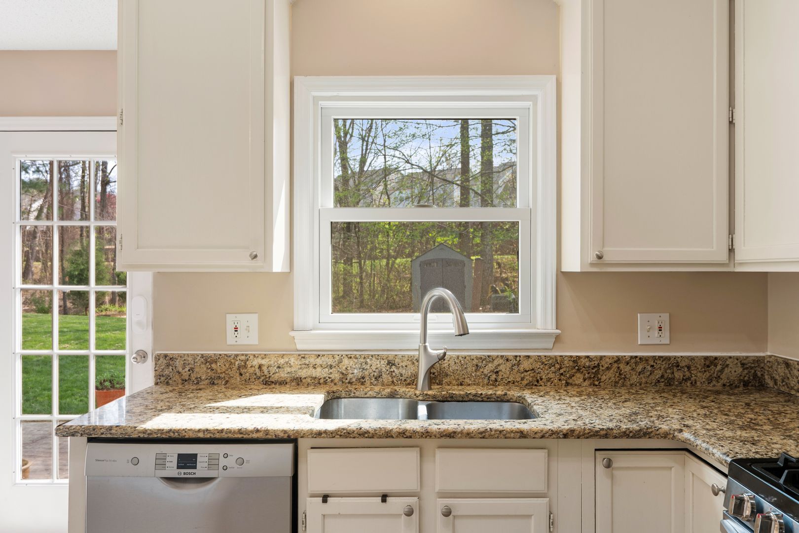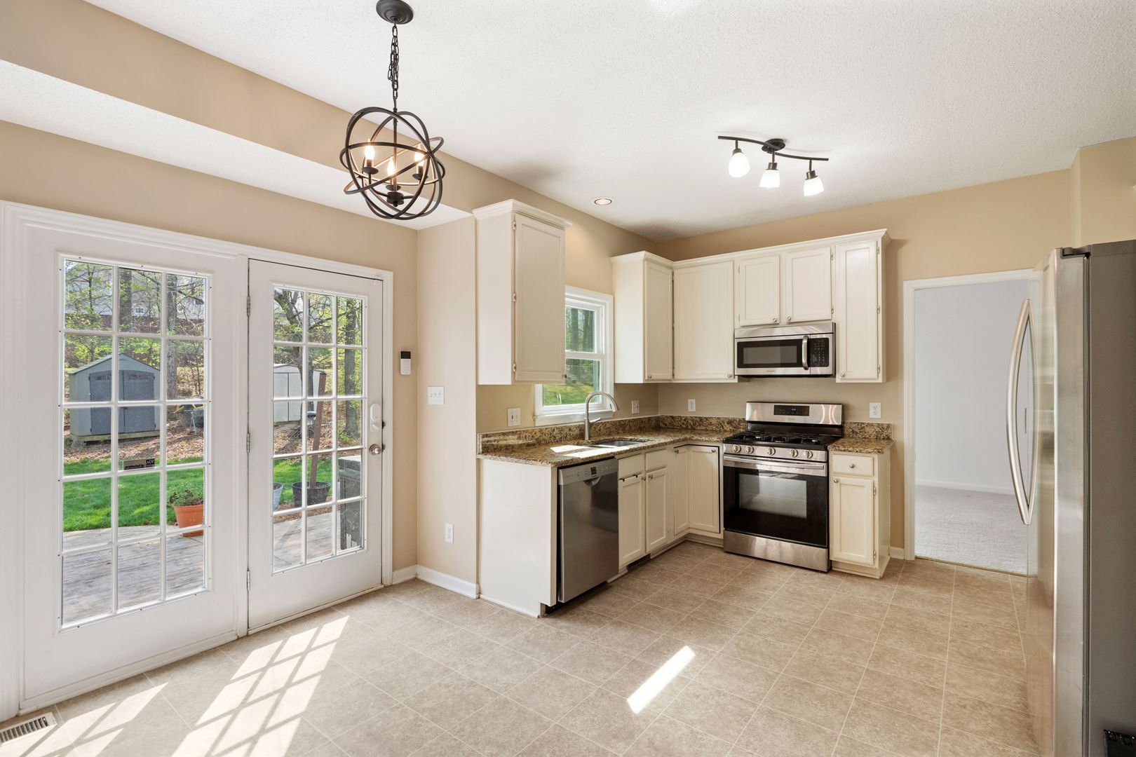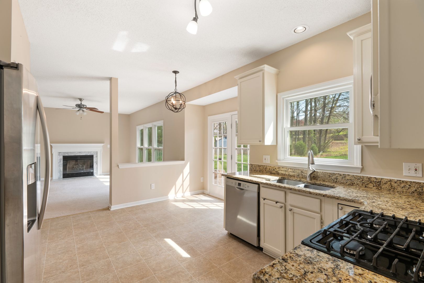 The cozy family room includes a fireplace, ceiling fan, and a wall of windows, seamlessly connecting to the updated kitchen. The kitchen is a standout with granite countertops, crisp white cabinetry, stainless steel appliances, and a sunny breakfast nook. French doors lead out to a spacious deck, perfect for entertaining or relaxing while overlooking the huge, flat backyard.