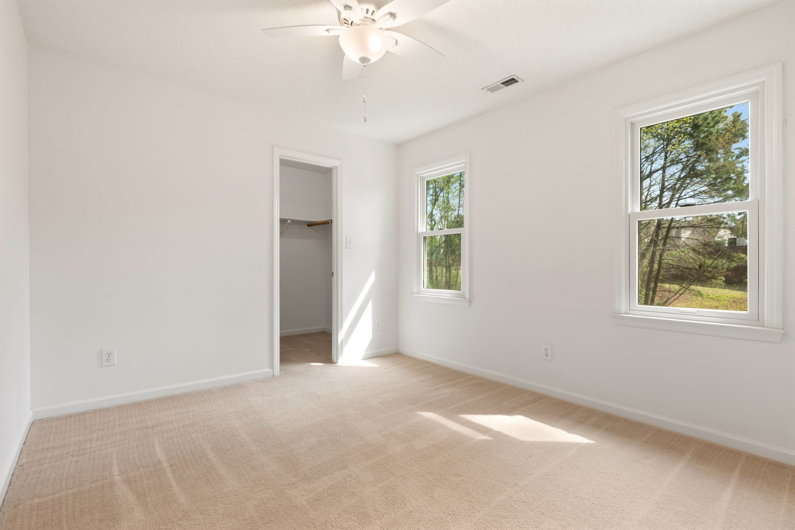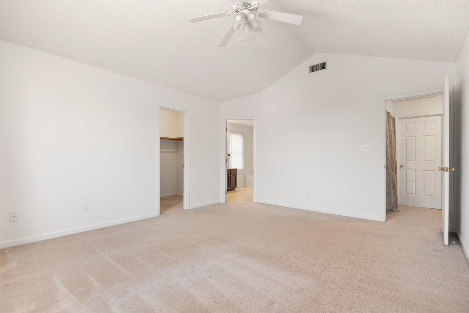 The primary suite features a vaulted ceiling, ceiling fan, and a walk-in closet. The en-suite bath offers a spa-like retreat with a dual vanity, garden tub, and frameless glass shower.