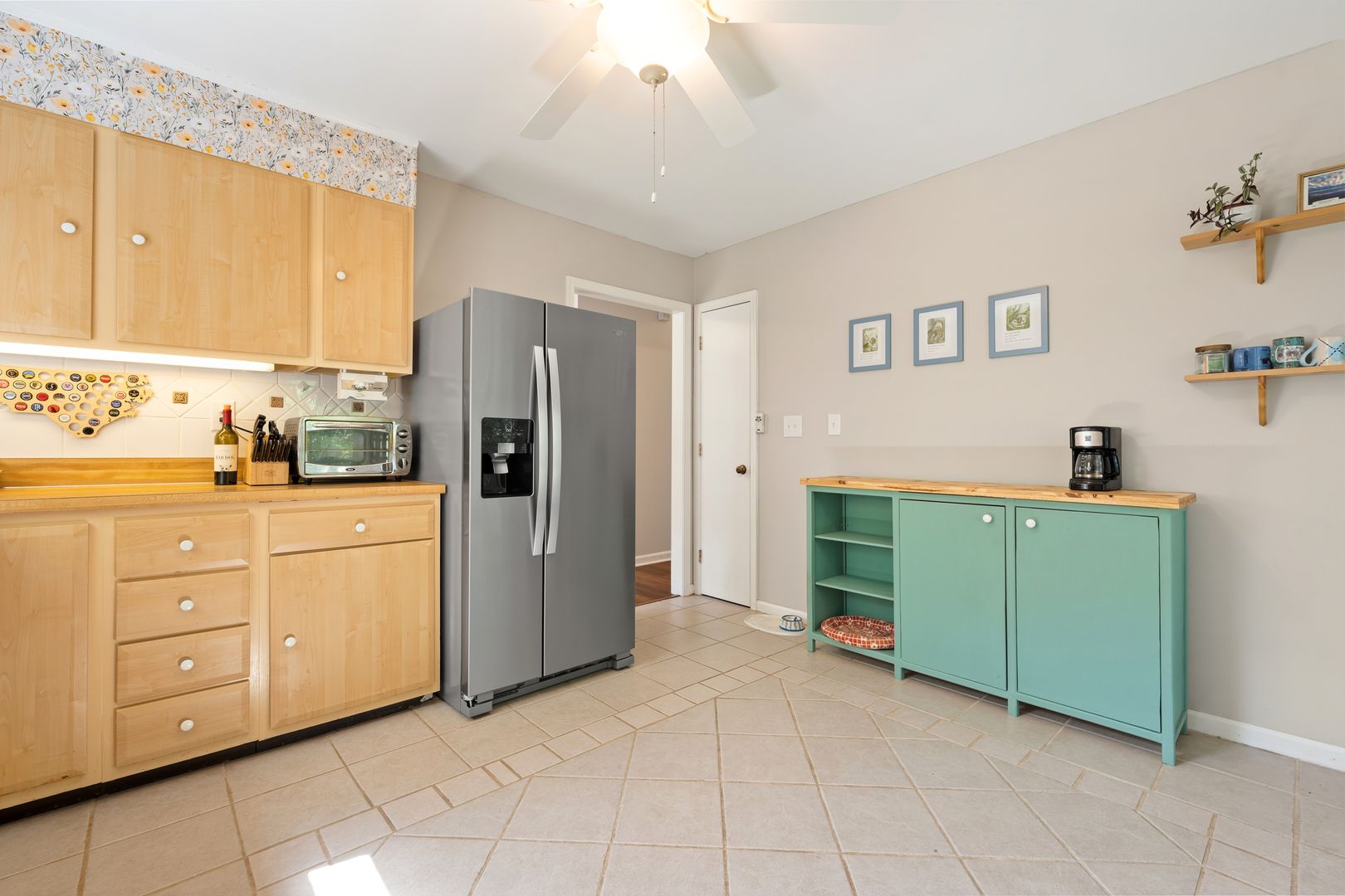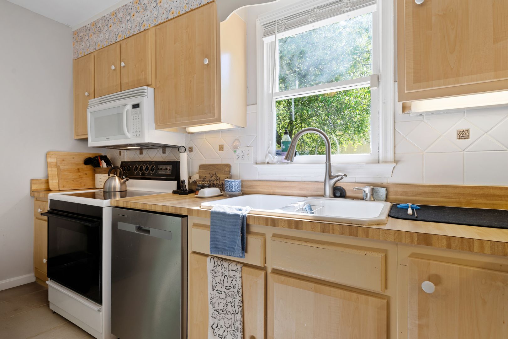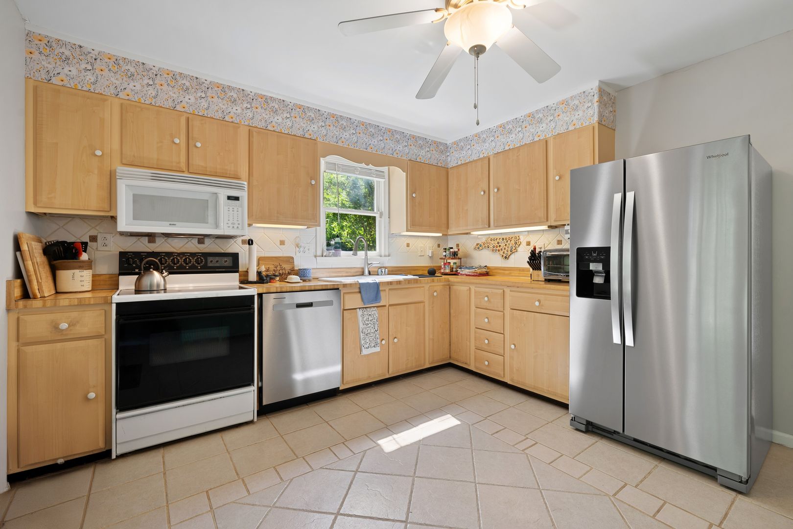 The home features a bright living area with rich dark-wood laminate flooring. A large bay window serves as a focal point, flooding the room with natural light. The kitchen features warm, light-wood cabinetry that contrasts beautifully with a sophisticated floral wallpaper border above the upper cabinets. It's fully equipped with the appliances you need. The primary bedroom is generous, featuring a ceiling fan and large windows. The room can comfortably hold a king-sized suite. The ensuite boasts a walk-in shower with high-end floor-to-ceiling stone-look tiling and a built-in niche for toiletries. The house also counts with a in-unit laundry with shelves for storage.