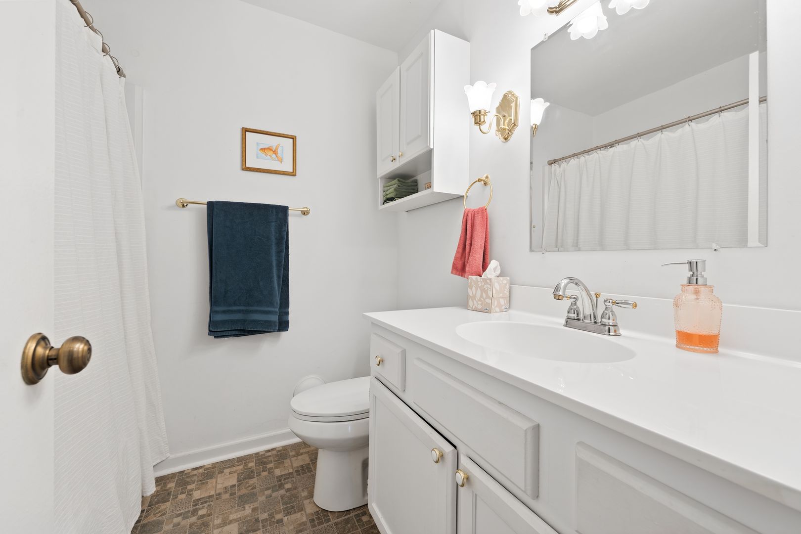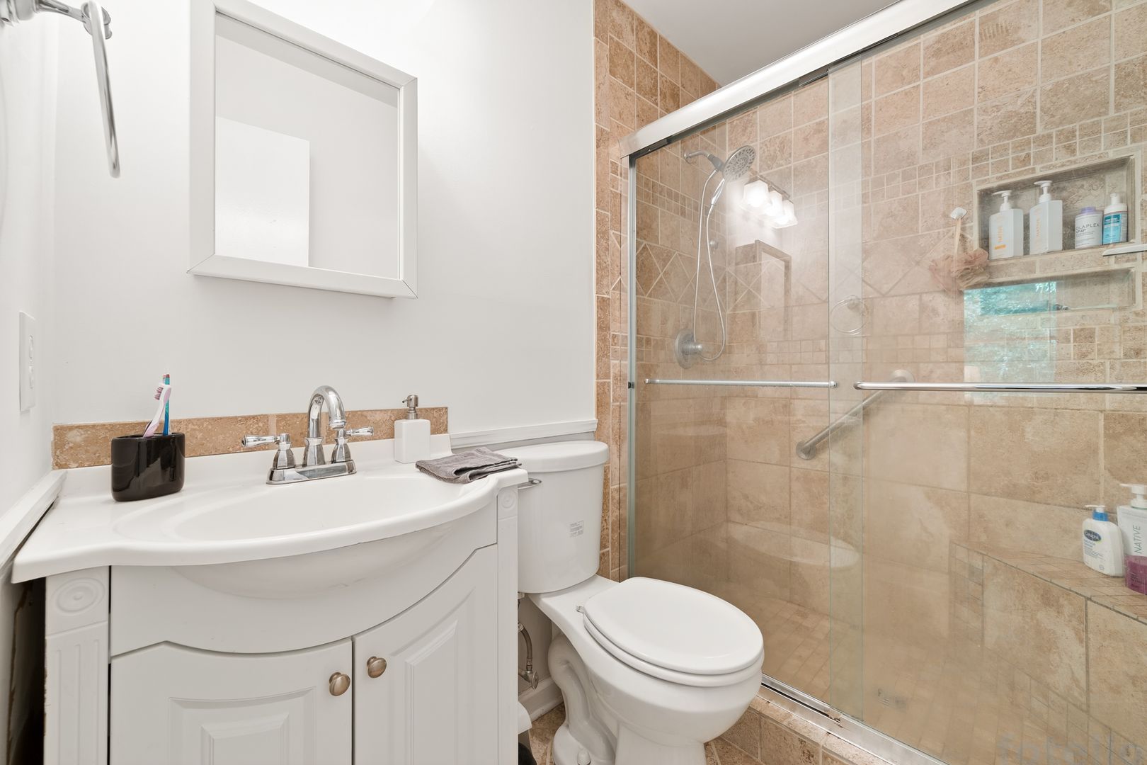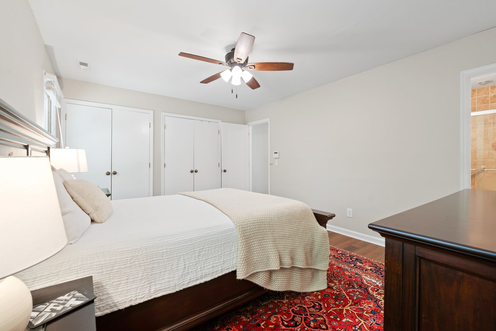 The home features a bright living area with rich dark-wood laminate flooring. A large bay window serves as a focal point, flooding the room with natural light. The kitchen features warm, light-wood cabinetry that contrasts beautifully with a sophisticated floral wallpaper border above the upper cabinets. It's fully equipped with the appliances you need. The primary bedroom is generous, featuring a ceiling fan and large windows. The room can comfortably hold a king-sized suite. The ensuite boasts a walk-in shower with high-end floor-to-ceiling stone-look tiling and a built-in niche for toiletries. The house also counts with a in-unit laundry with shelves for storage.
