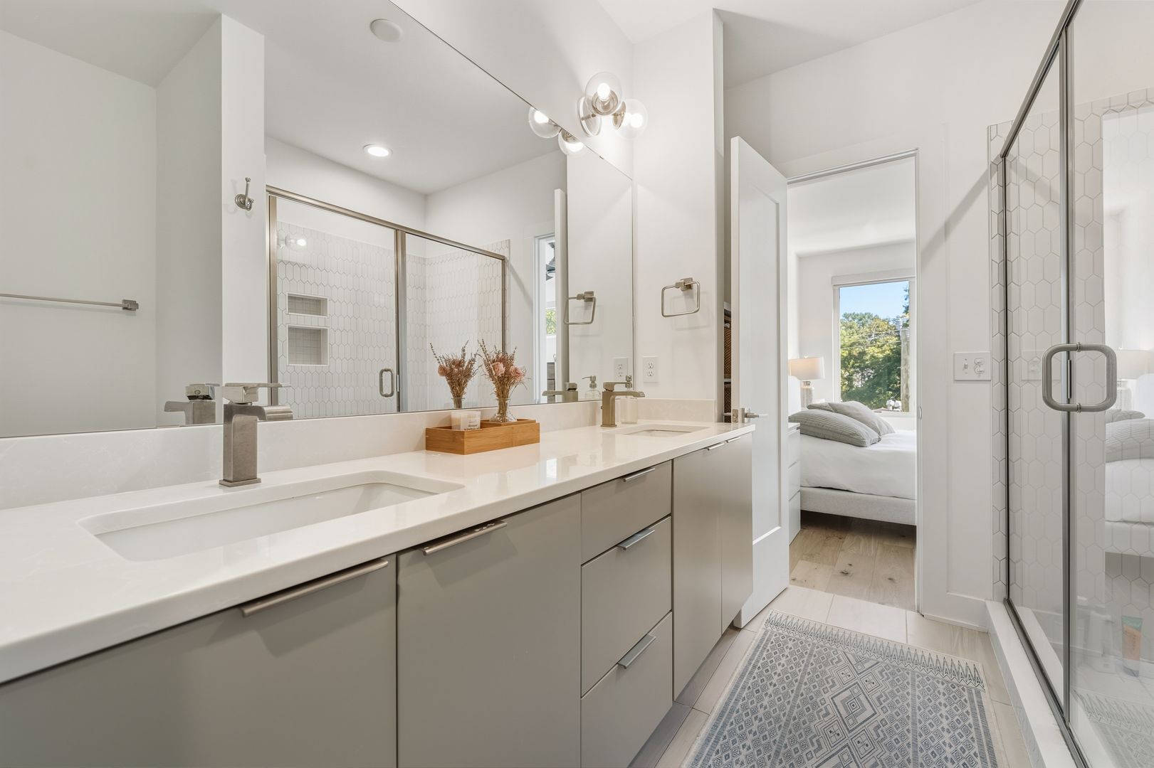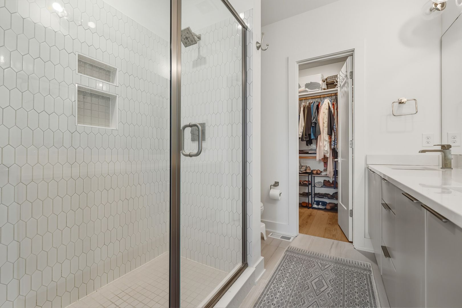 The primary bedroom ensuite features a spacious walk-in closet and a private bathroom with luxurious walk-in shower and dual vanities, offering a personal spa-like retreat.