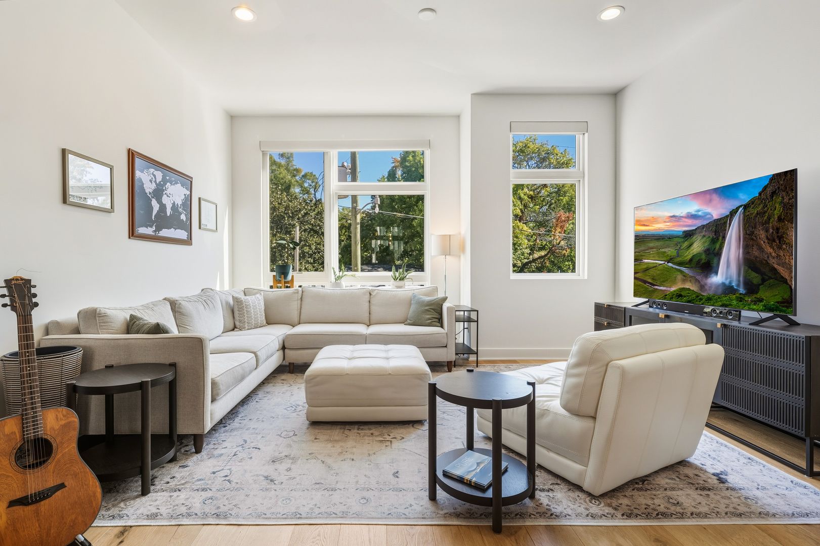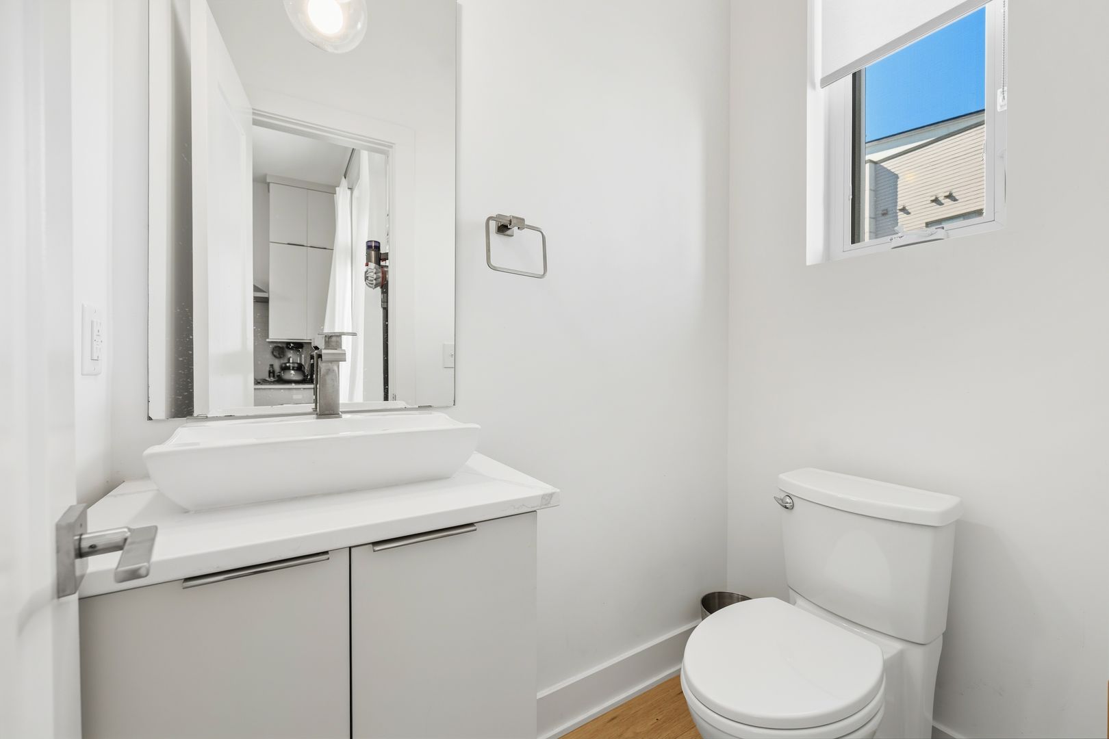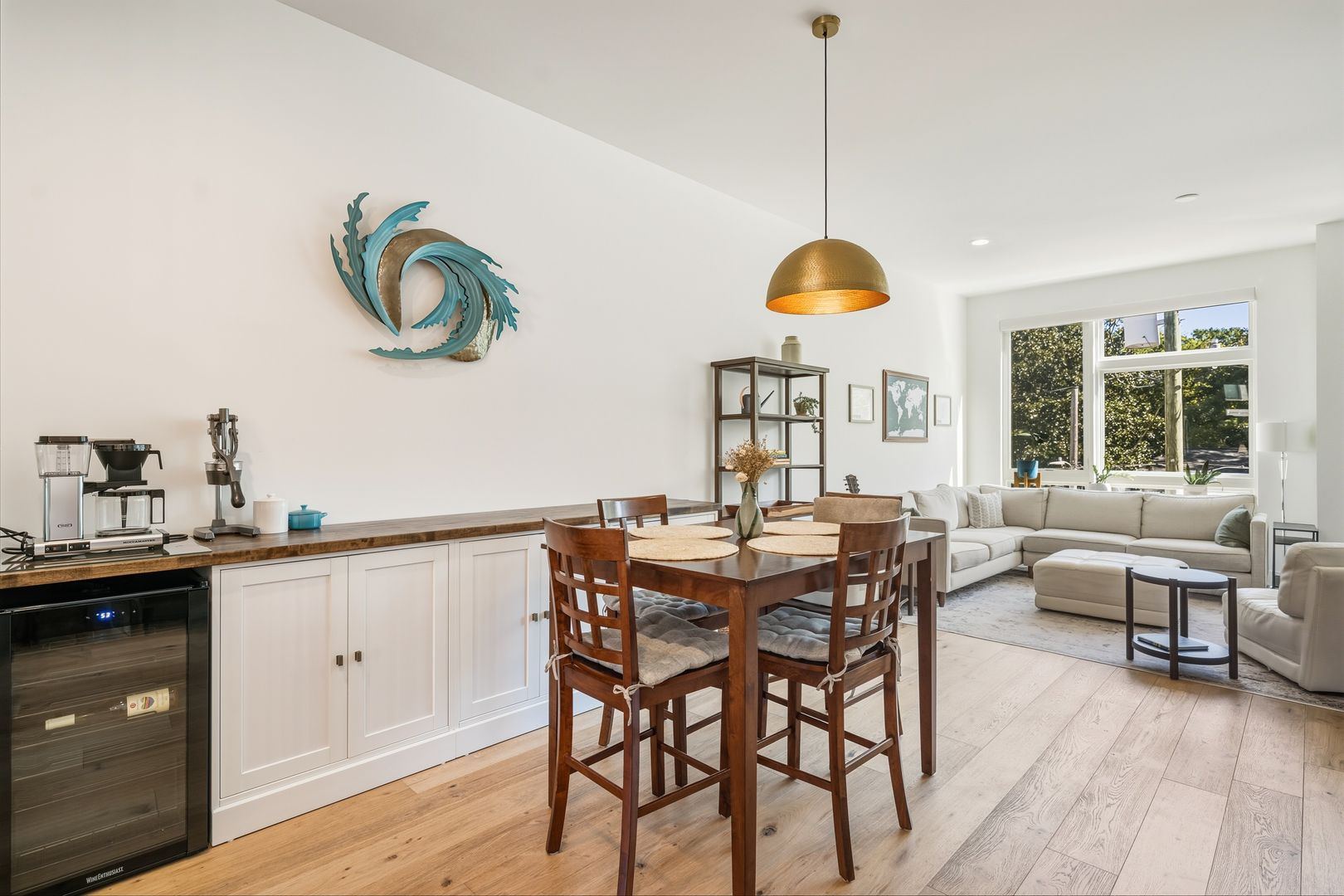 The modern finishes and beautiful hardwood floors add a touch of elegance and warmth to the spacious light-filled living area, complemented by updated lighting fixtures.