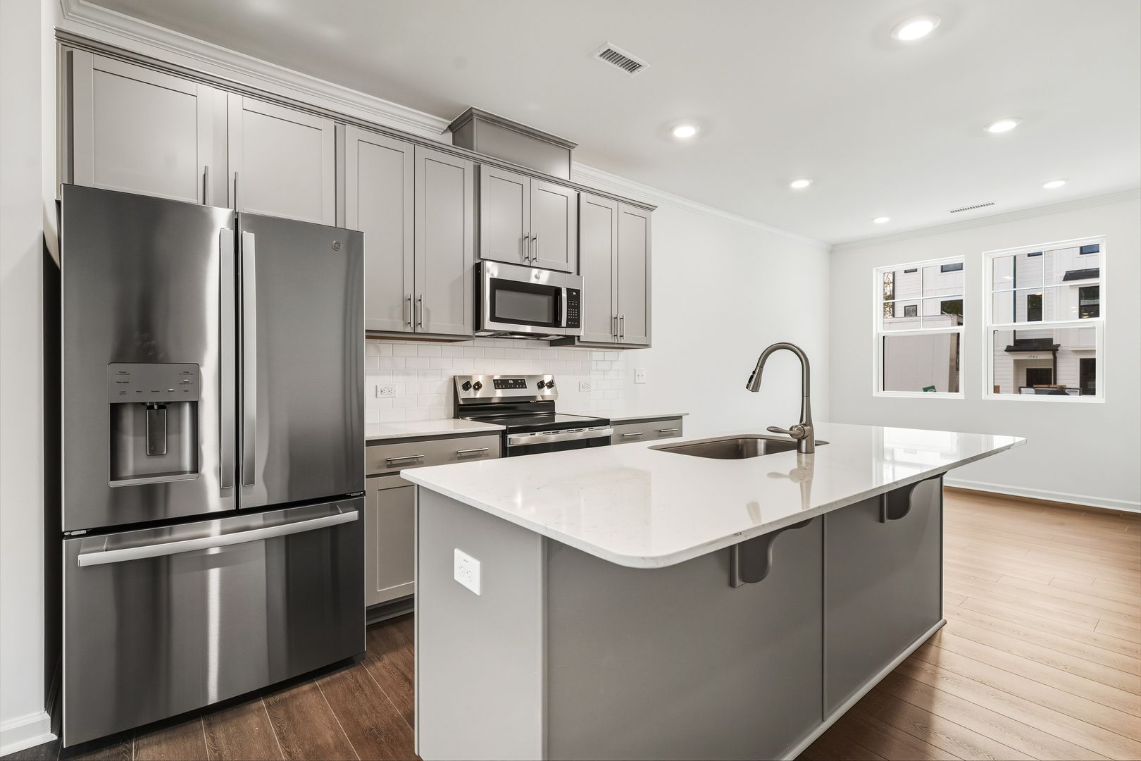 Step inside to find an open-concept main floor with luxury vinyl plank flooring, a bright and airy living area, and a chef’s kitchen featuring quartz countertops, stainless steel appliances, and a spacious island perfect for entertaining. Each bedroom includes its own private or nearby bath, providing comfort and privacy for everyone. The top-floor bonus suite is ideal for a home office, media room, or guest space.