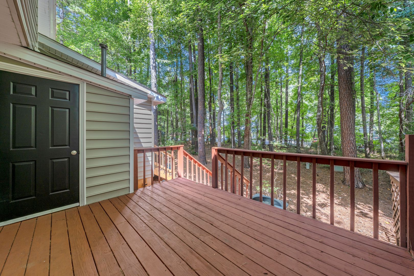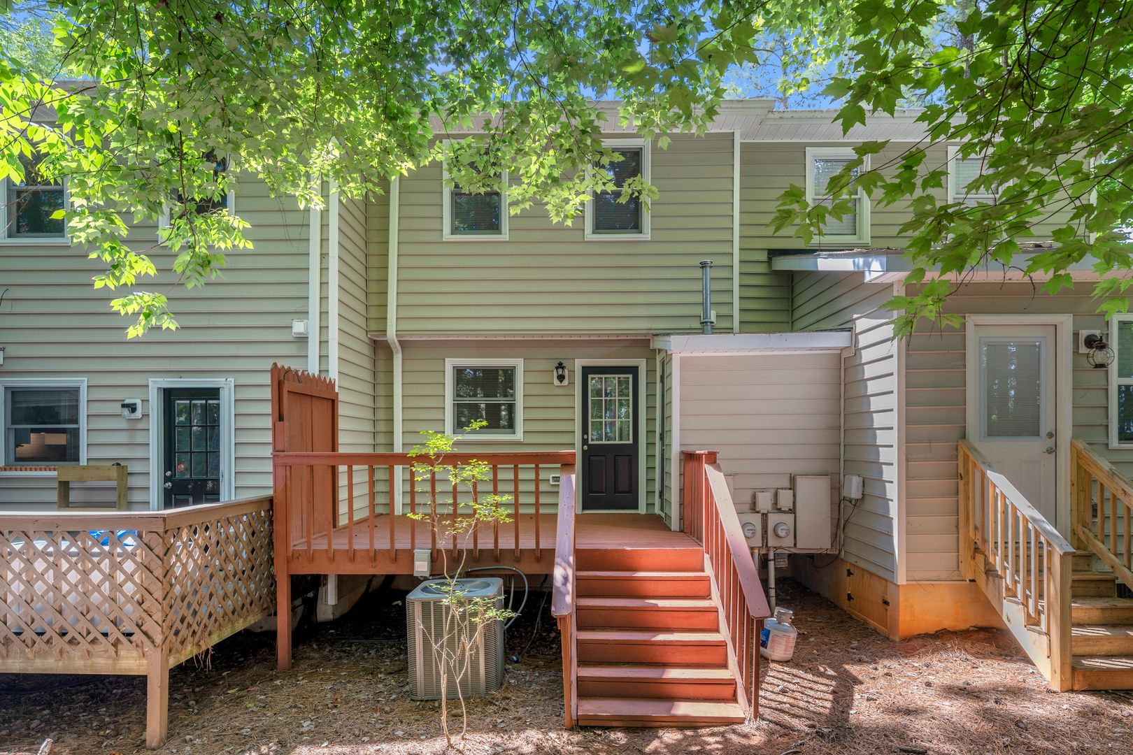 Outside, you can relax on the back deck amongst the trees! Exterior yard maintenance is provided by the HOA at no cost to the tenant.