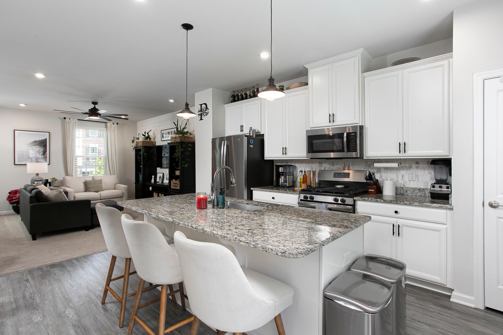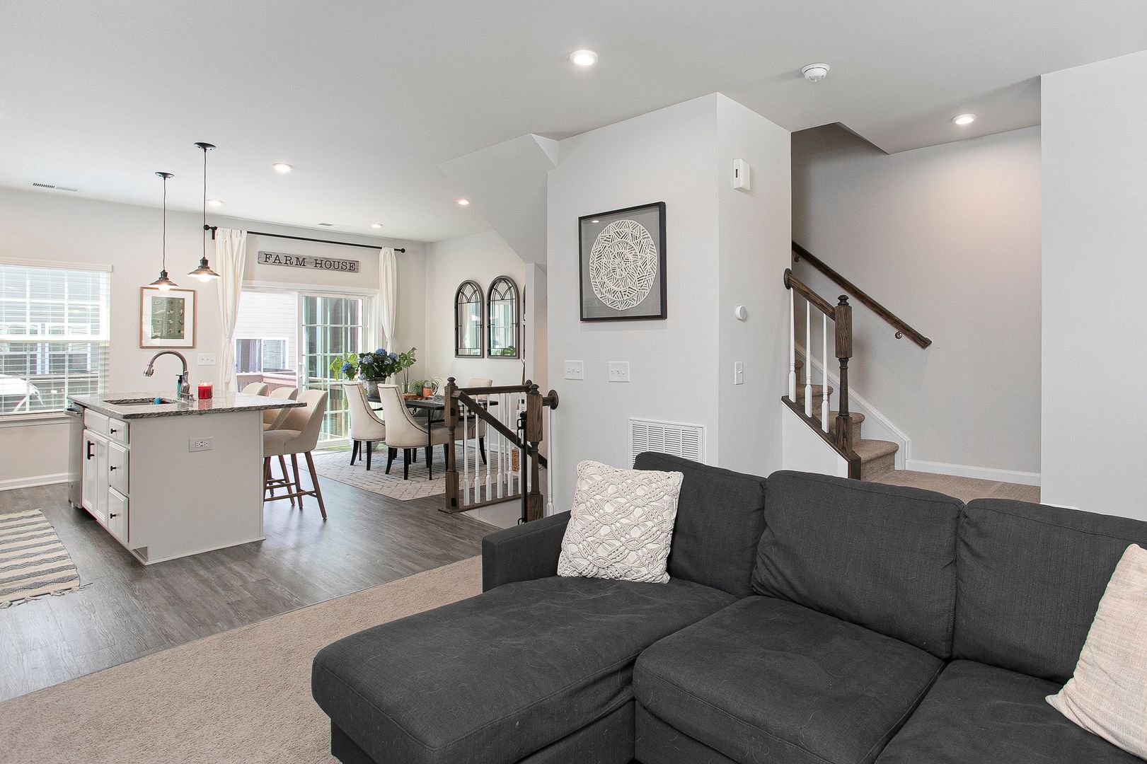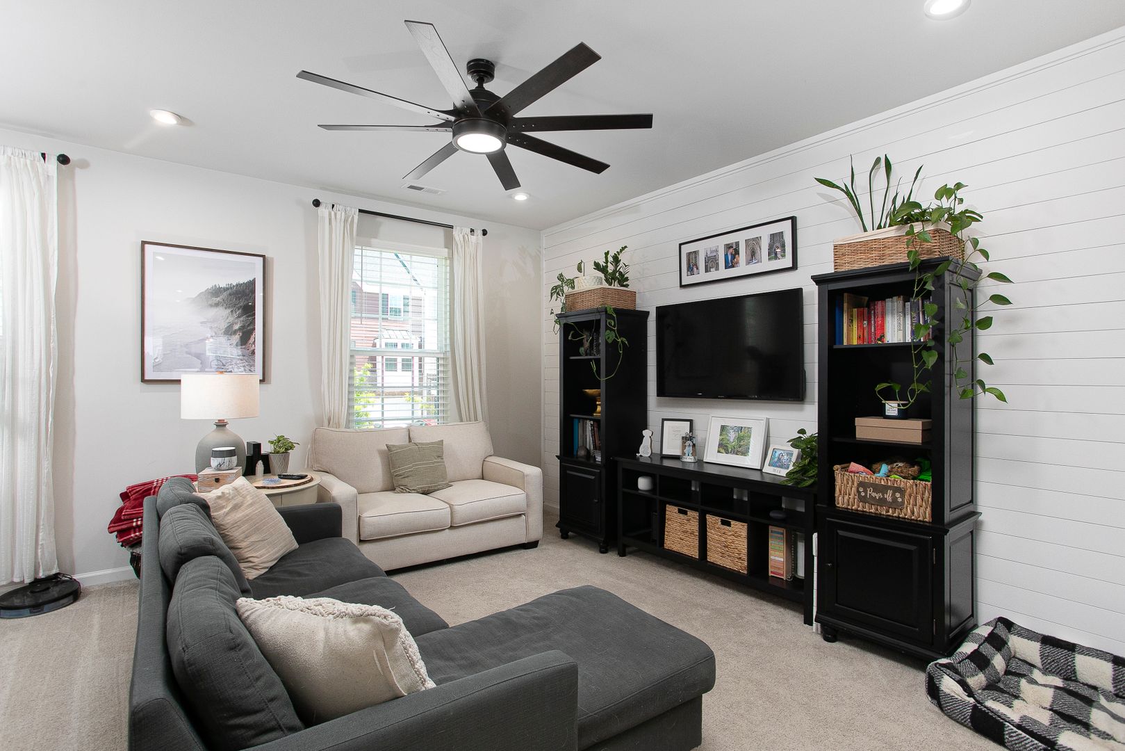 The main level offers an open floor plan connecting the living, dining, and kitchen areas with a shiplap accent wall in the living room. The kitchen includes modern appliances, ample counter space, and plenty of cabinet storage.