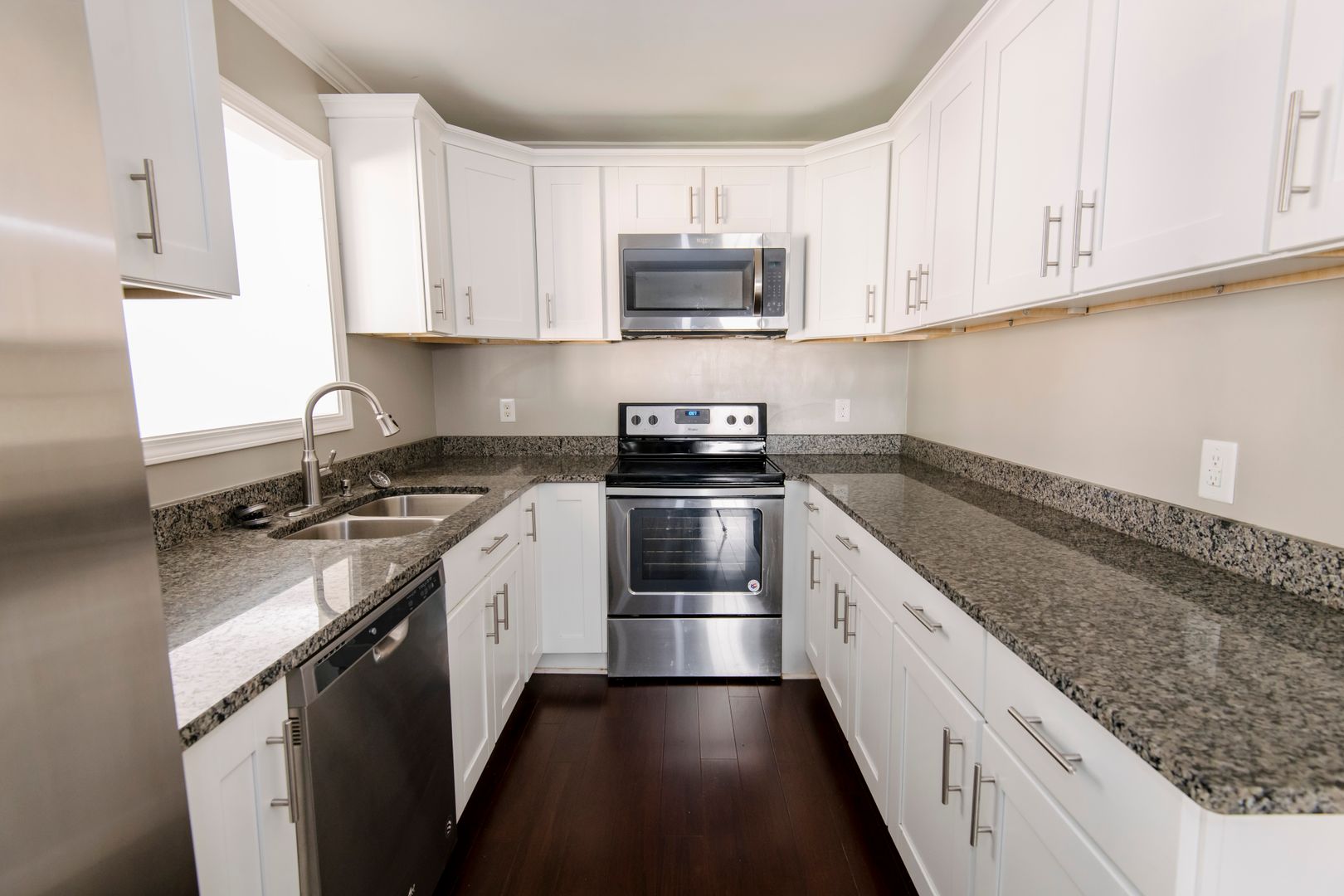 This beautifully renovated, flexible floor plan features hardwood floors, great sized bedrooms, large windows, two full baths, and a one-car garage. The upgraded kitchen features stainless steel appliances, granite countertops, and upgraded cabinets. Separate dining room and family room off kitchen look onto private fenced-in backyard and two sun decks! Not to mention the luxurious walk-in, tiled shower in primary bath plus washer + dryer included!