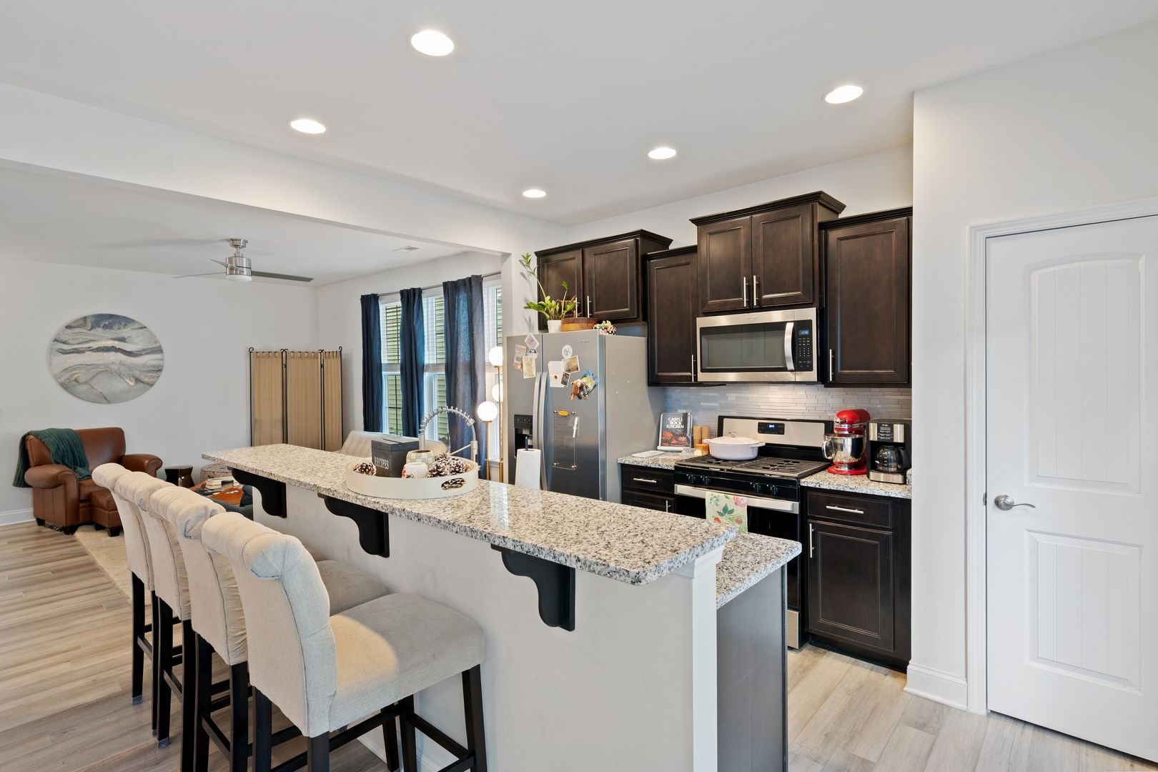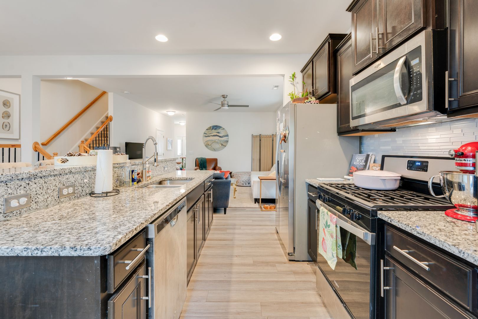 Kitchen includes Stainless Steel Appliances and Granite Countertops, Refrigerator, Gas Range, Dishwasher, Garbage Disposal, Microwave, and Ice Maker.