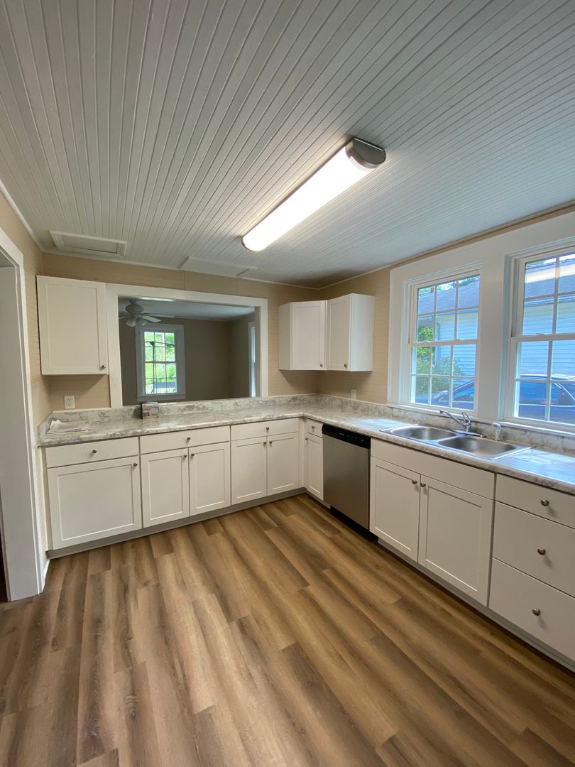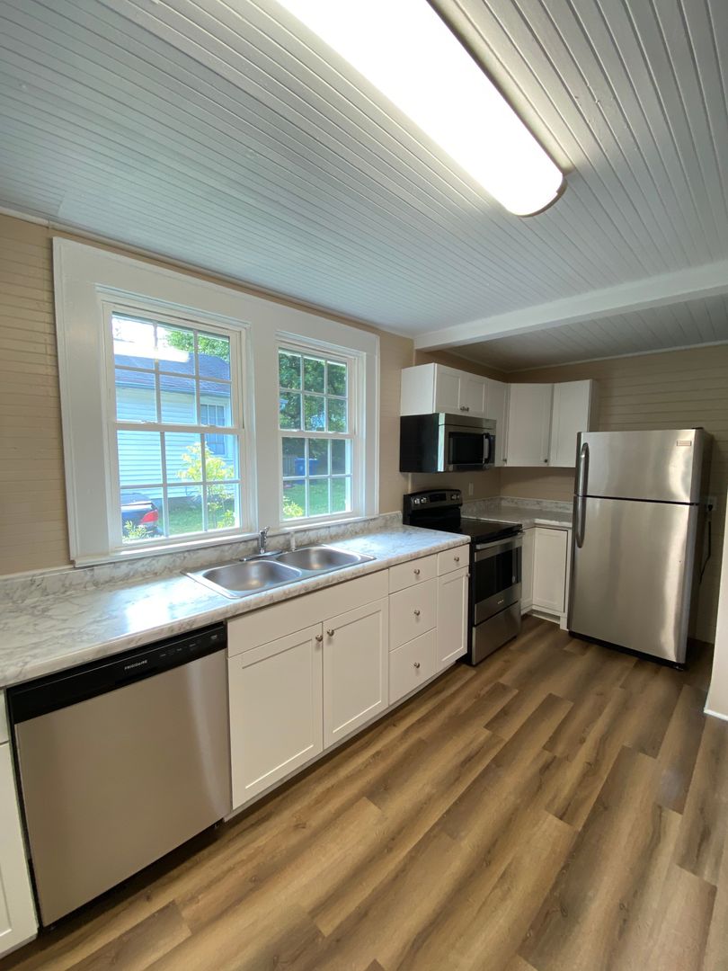 This cozy bungalow offers a recently refreshed kitchen with waterproof vinyl plank flooring, new cabinets and countertops! This kitchen was made with convenience in mind with the extended countertop area as well as the additional cabinet space and stainless steel appliances! Walk out the back door and you’ll find a fully fenced backyard perfect for your pets along with a storage shed and private driveway.