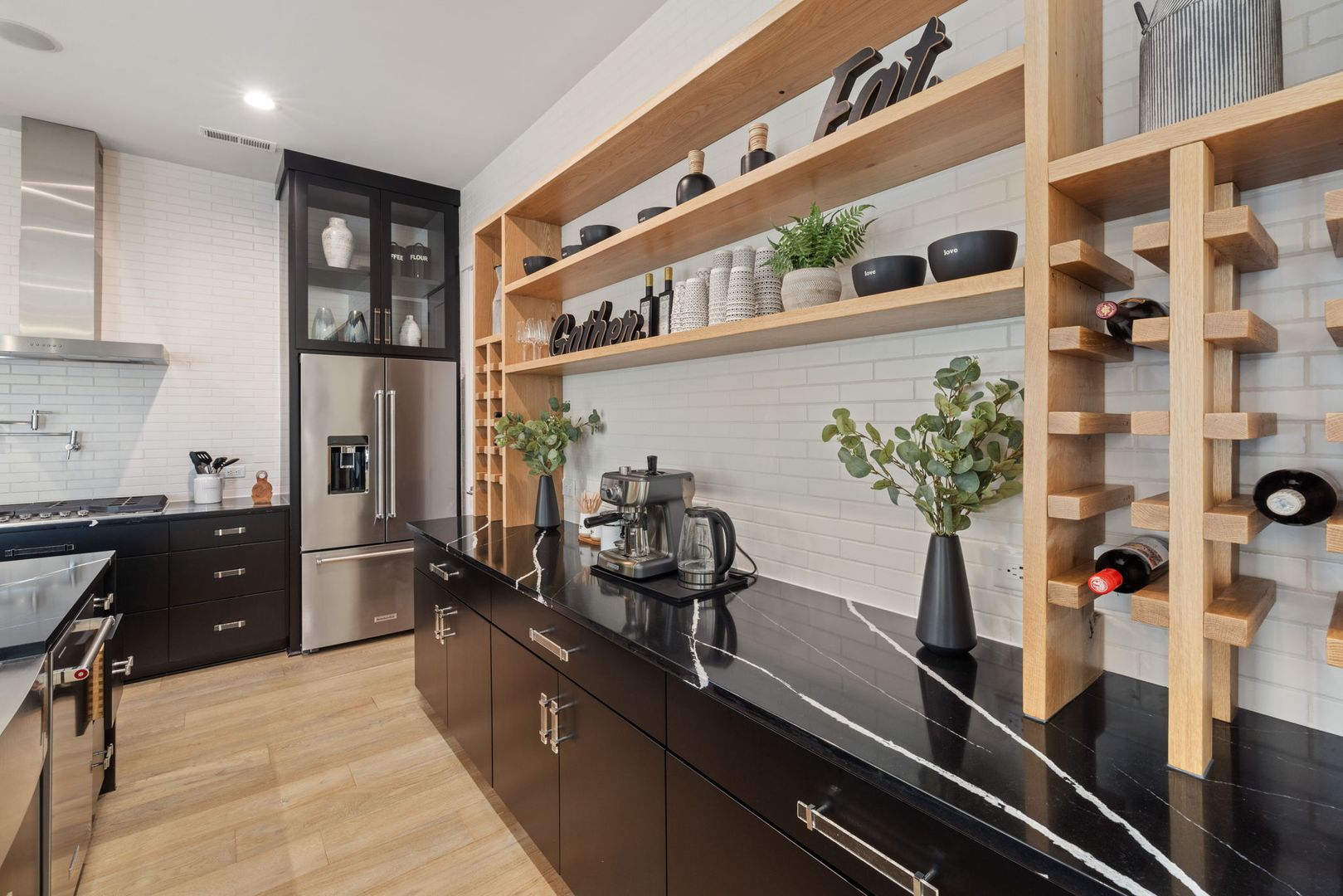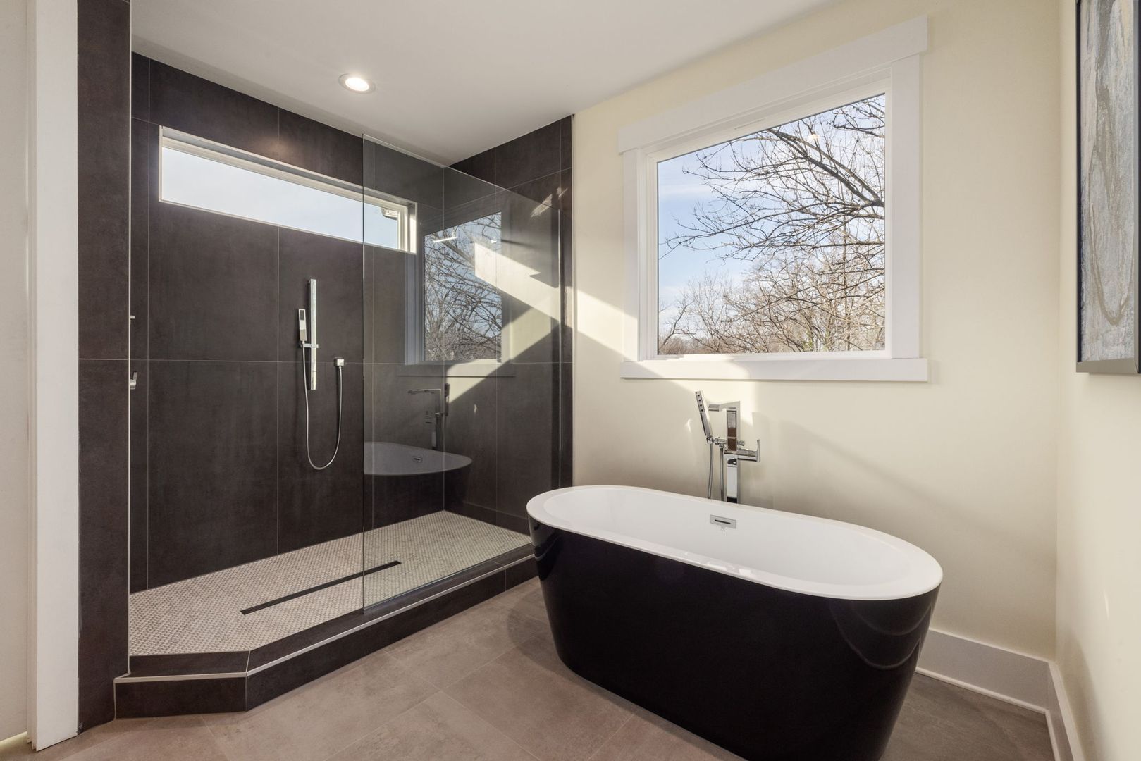 A double-sided fireplace brings warmth and sophistication to the main living spaces, and the rich oak hardwood floors add timeless character throughout the home. Each bathroom feels spa-inspired, with one featuring a luxurious soaking tub that’s perfect for unwinding after a long day.