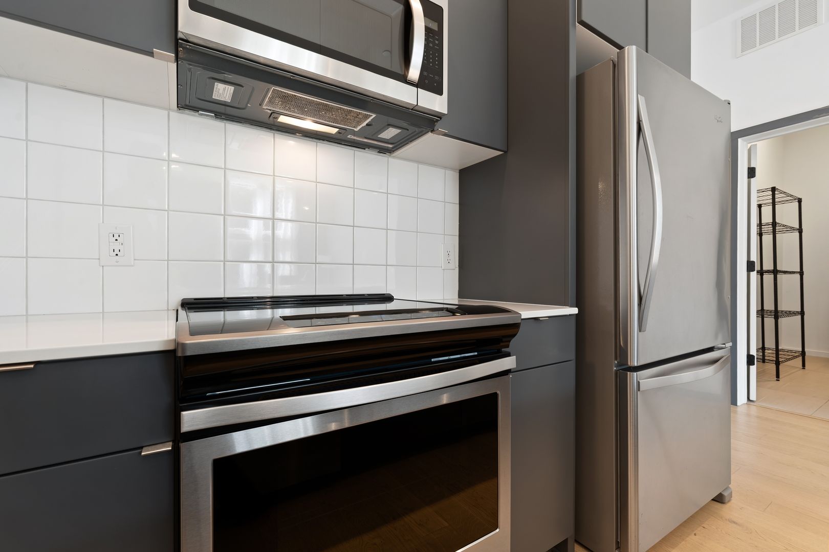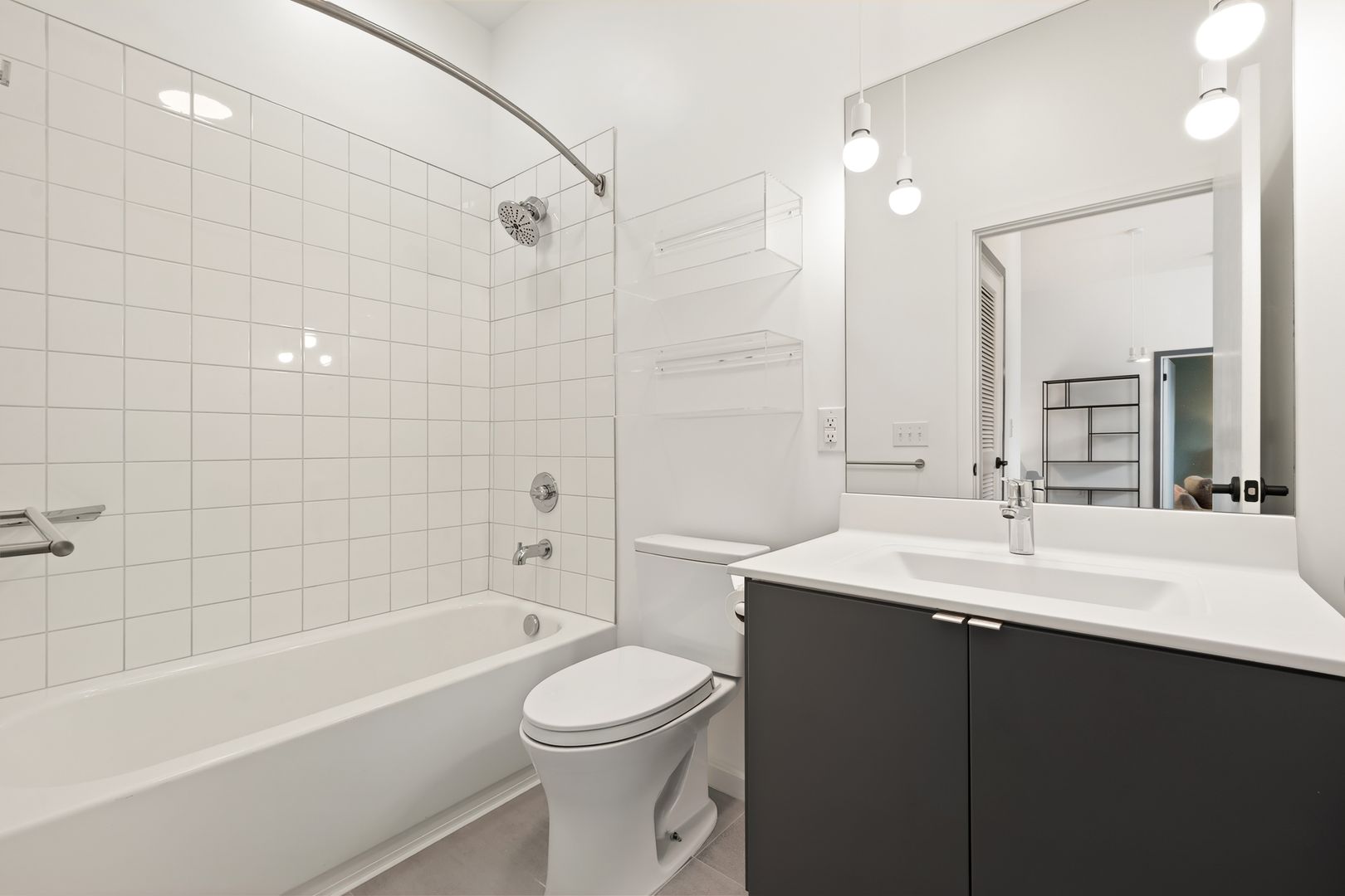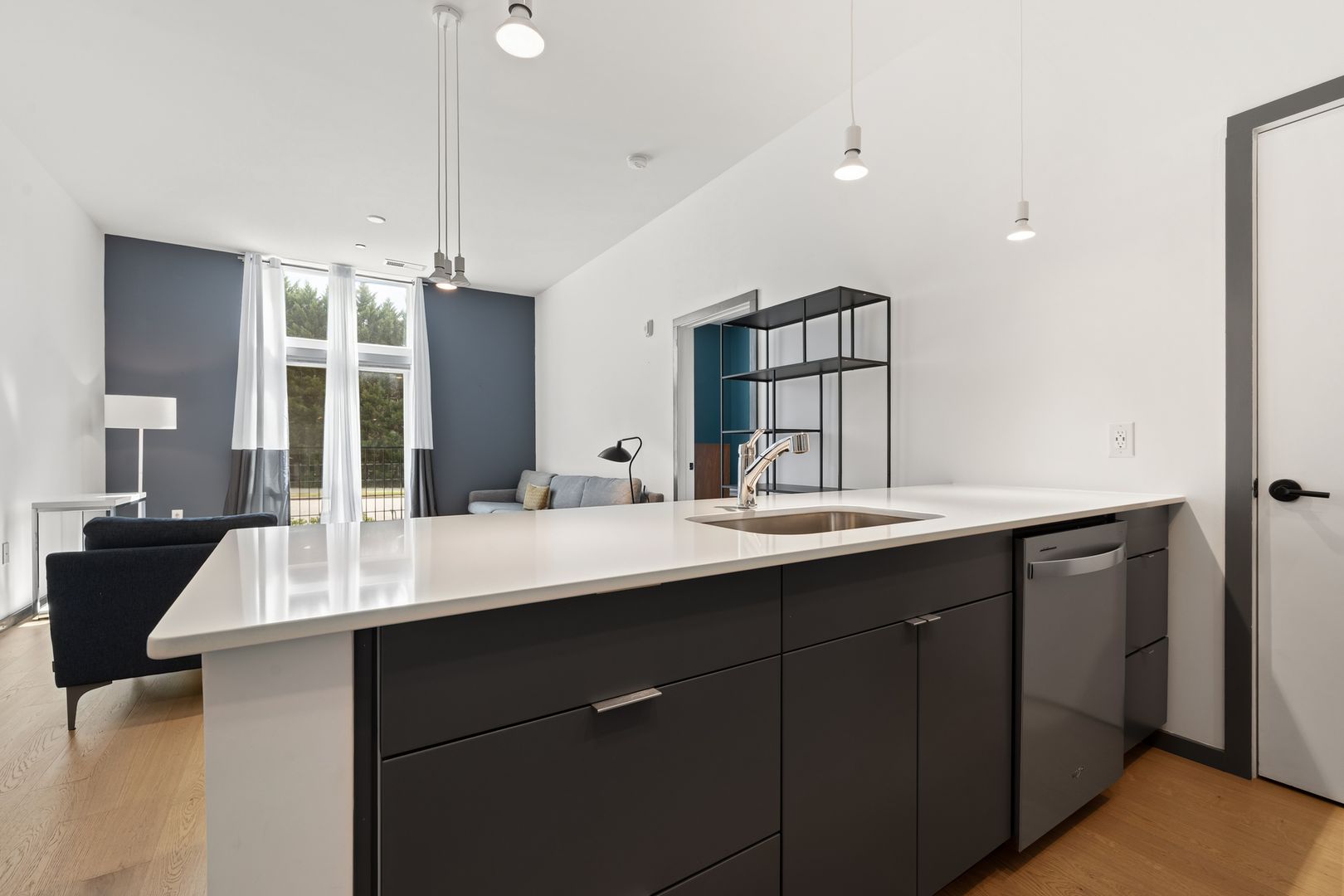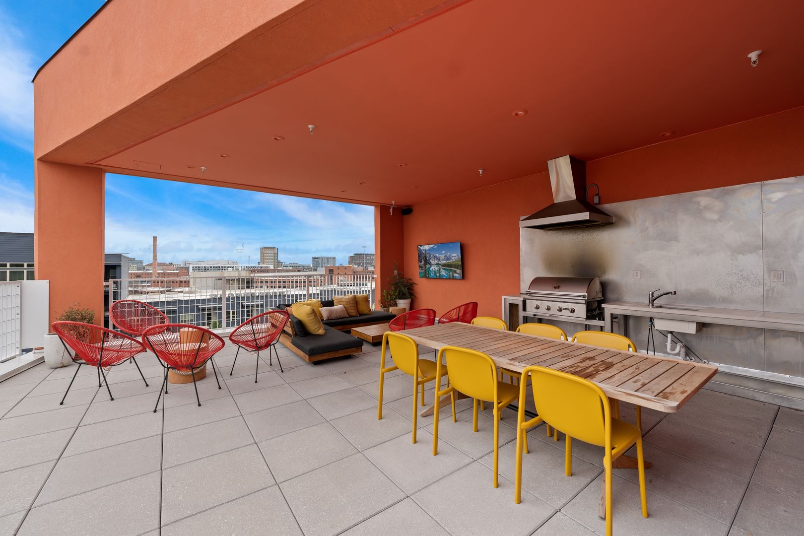 This modern 2 bedroom/ 2 Bath condo is located on the 1st floor with large windows and natural light! Features 10 ft ceilings, granite countertops, stainless appliances and washer + dryer. Private parking spot included. Enjoy the city view while you entertain, grill or enjoy the weekend fireworks from the Bulls stadium from the rooftop terrace. Rare find, schedule a viewing today!